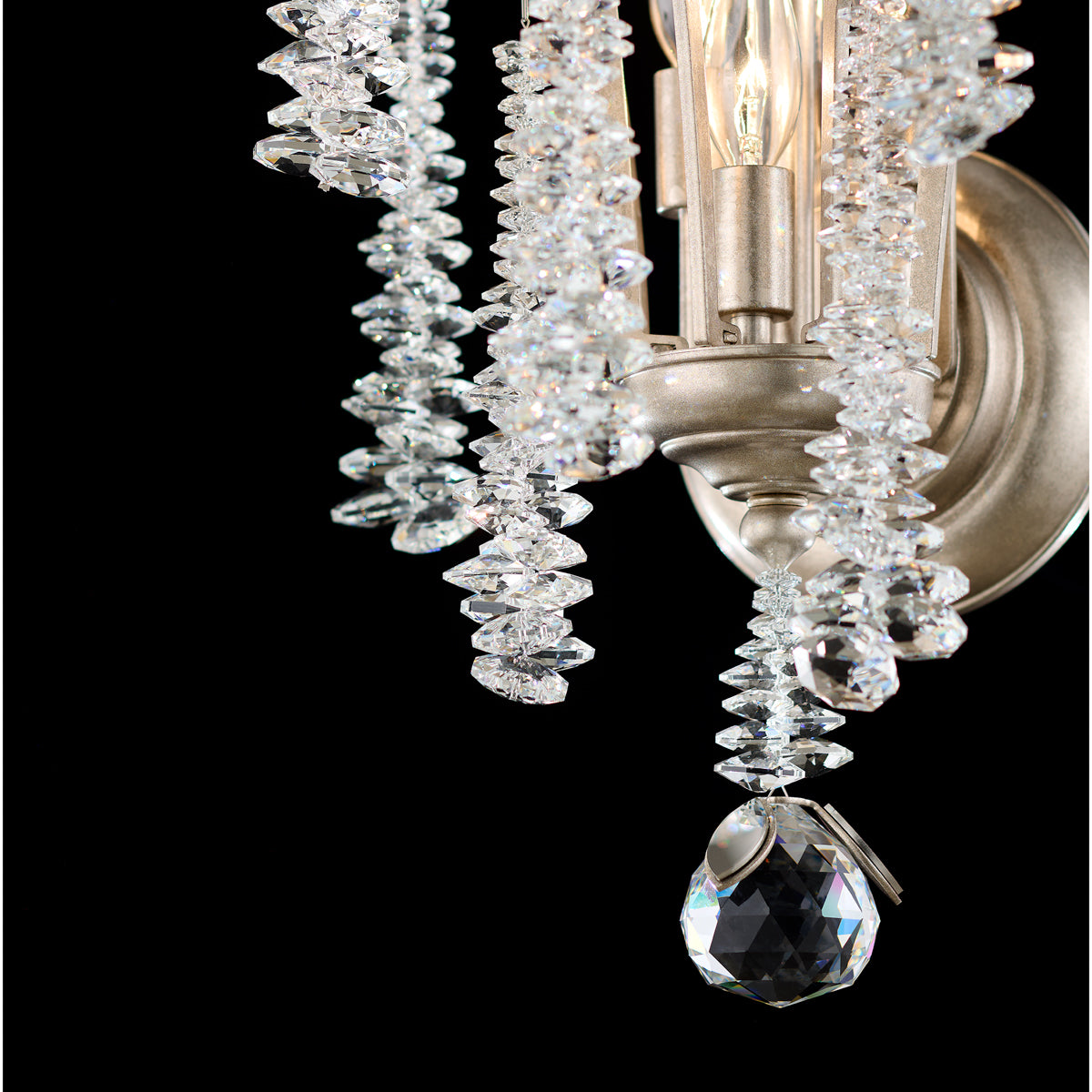 This enchanting wall luminaire blends classic Bohemian elegance with modern organic design. Cascading, layered octagon Radiance® Crystal strands fall like raindrops from gracefully sweeping arms topped with mirrored leaves, capturing refined artistry in every detail. Vintage-inspired glass supports the curved arms and adds a subtle touch of Old-World charm. A polished crystal ball finial completes this radiant piece, infusing any luxurious space with refined, organic beauty.