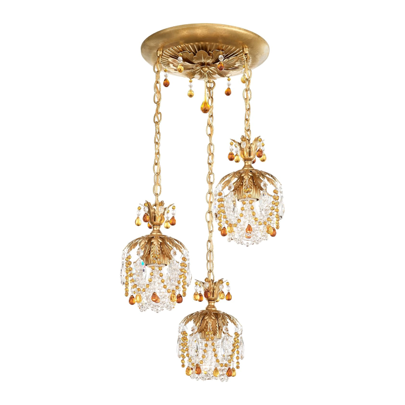 Available in Heirloom Gold finish. Soft amber crystal tones.